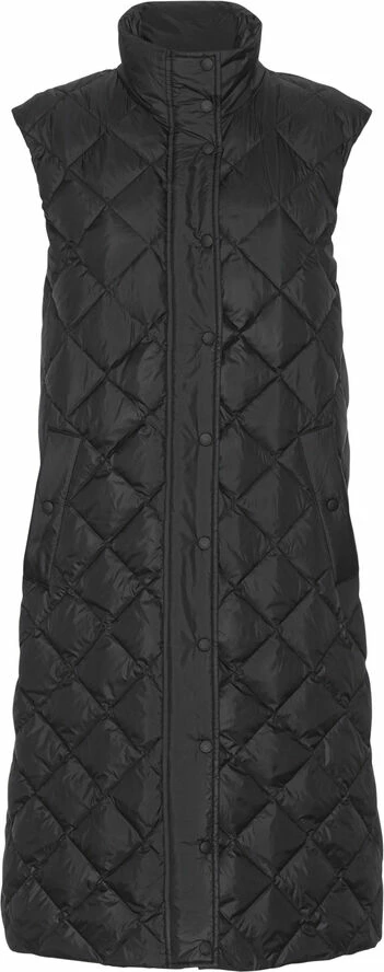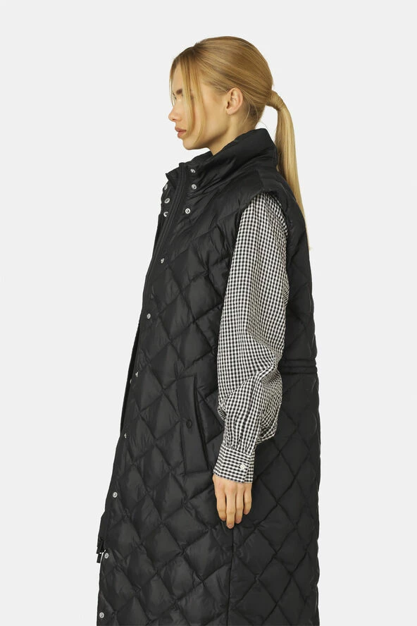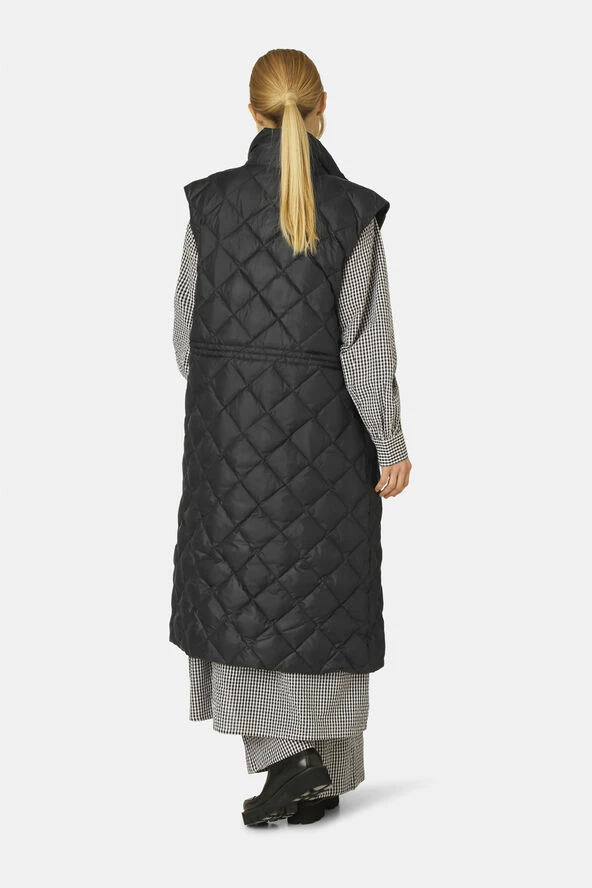 Long down vest in a diamond quilt pattern. This vest features drawstring at waist and 2-way YKK zip closure. This vest is perfect to wear as a inner layer on cold winter days.Composition: Exterior 100% Polyester, Lining 100% Nylon. Down/feather insulation: 90/10