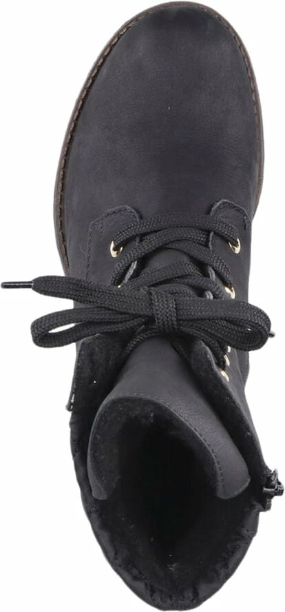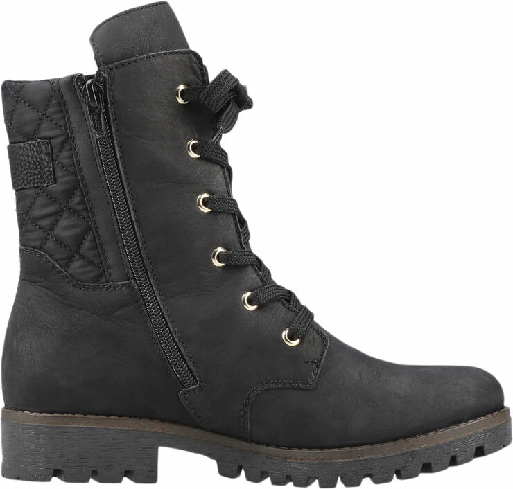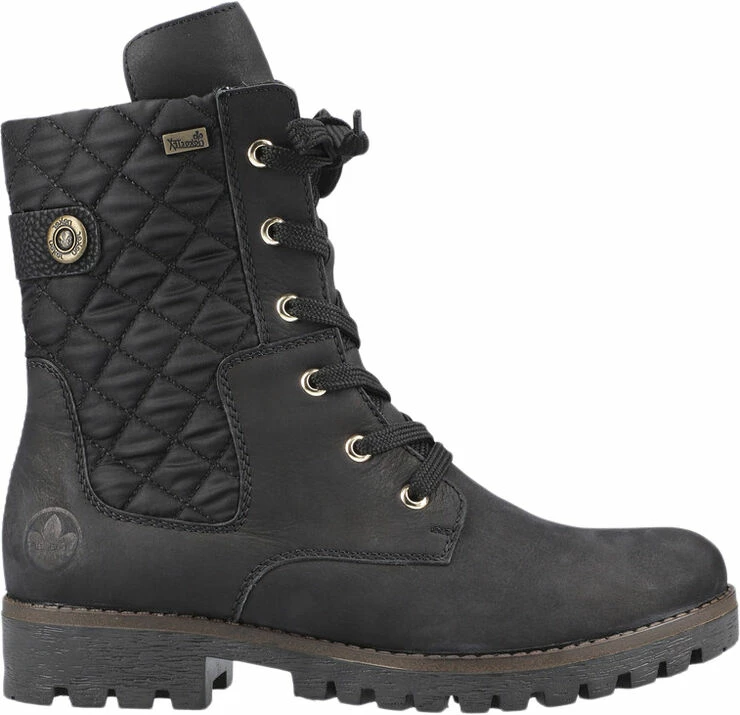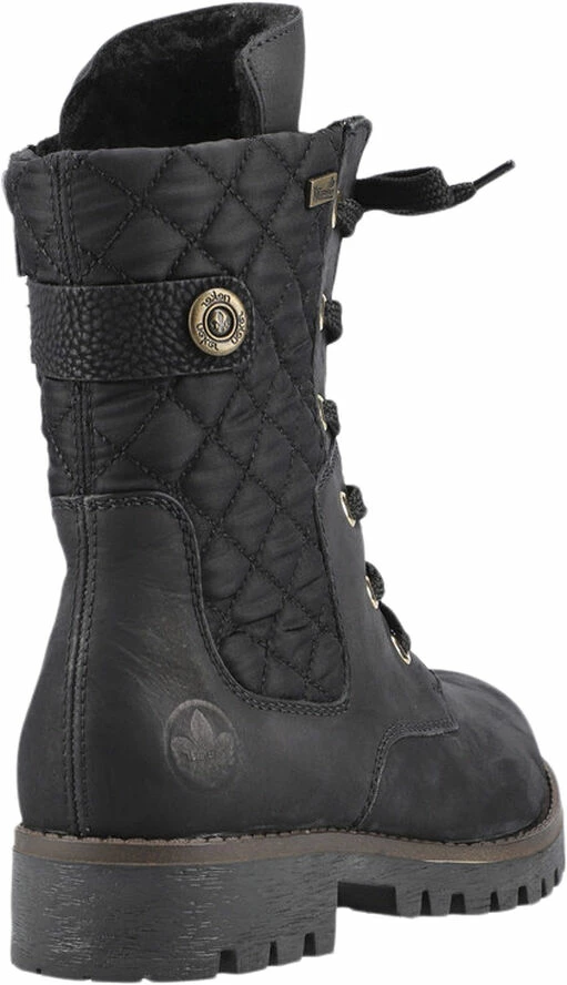 Skøn vinterstøvler fra Rieker i skind med varmt foer og vandafvisende tex-membran. Der er snørre og lynlås og en fin quilted detalje på skaftet.