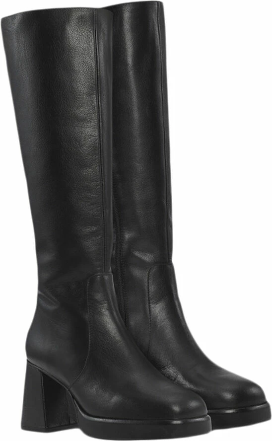 Cool long shafted calf leather boot with square toe, on a block heel and plateau under the forefoot, decorative cutouts on the shaft and zipper on the inside. Heel- 8 cm Plate- 1.5 cm Material- calf leather Look- cool, statement